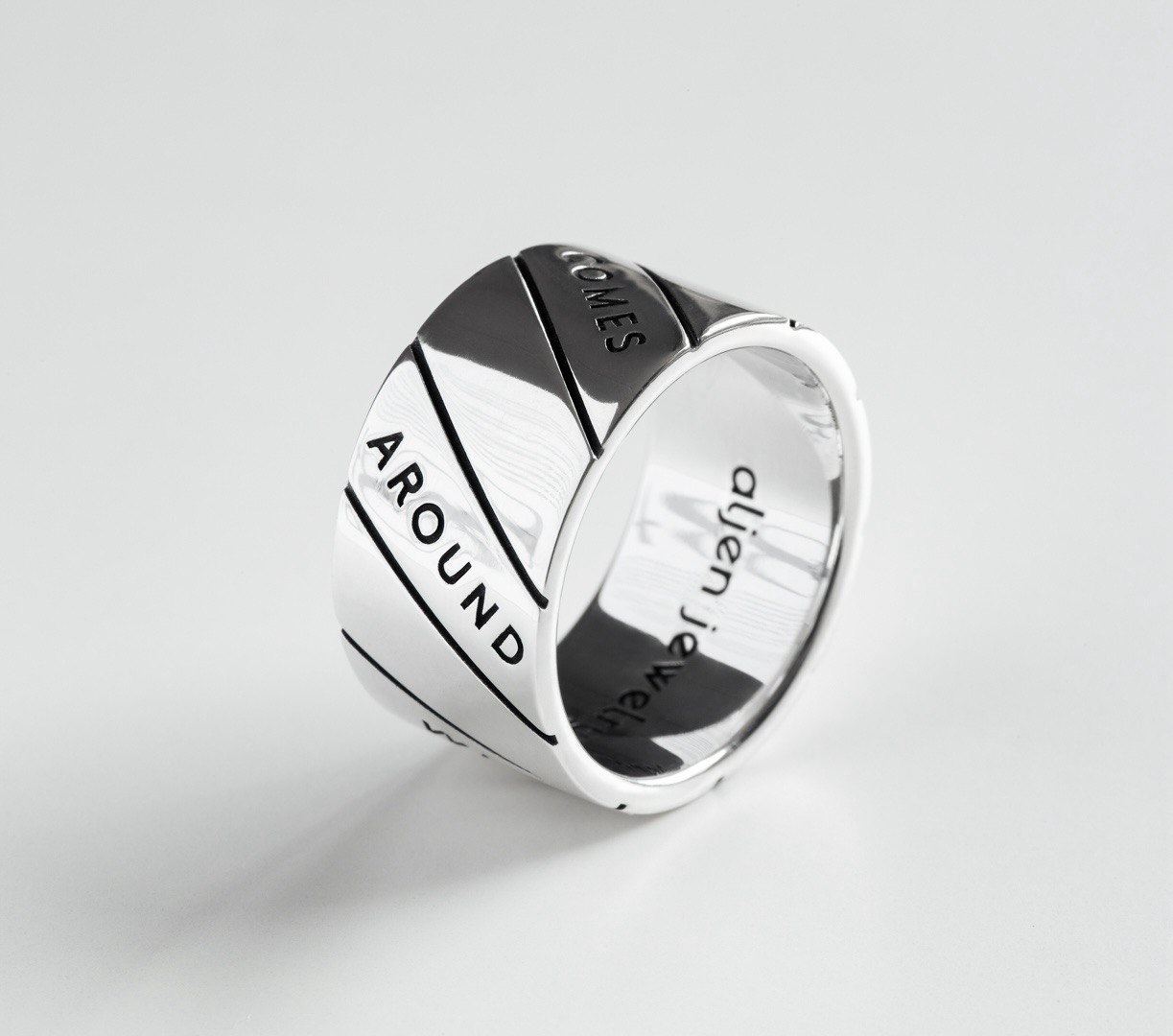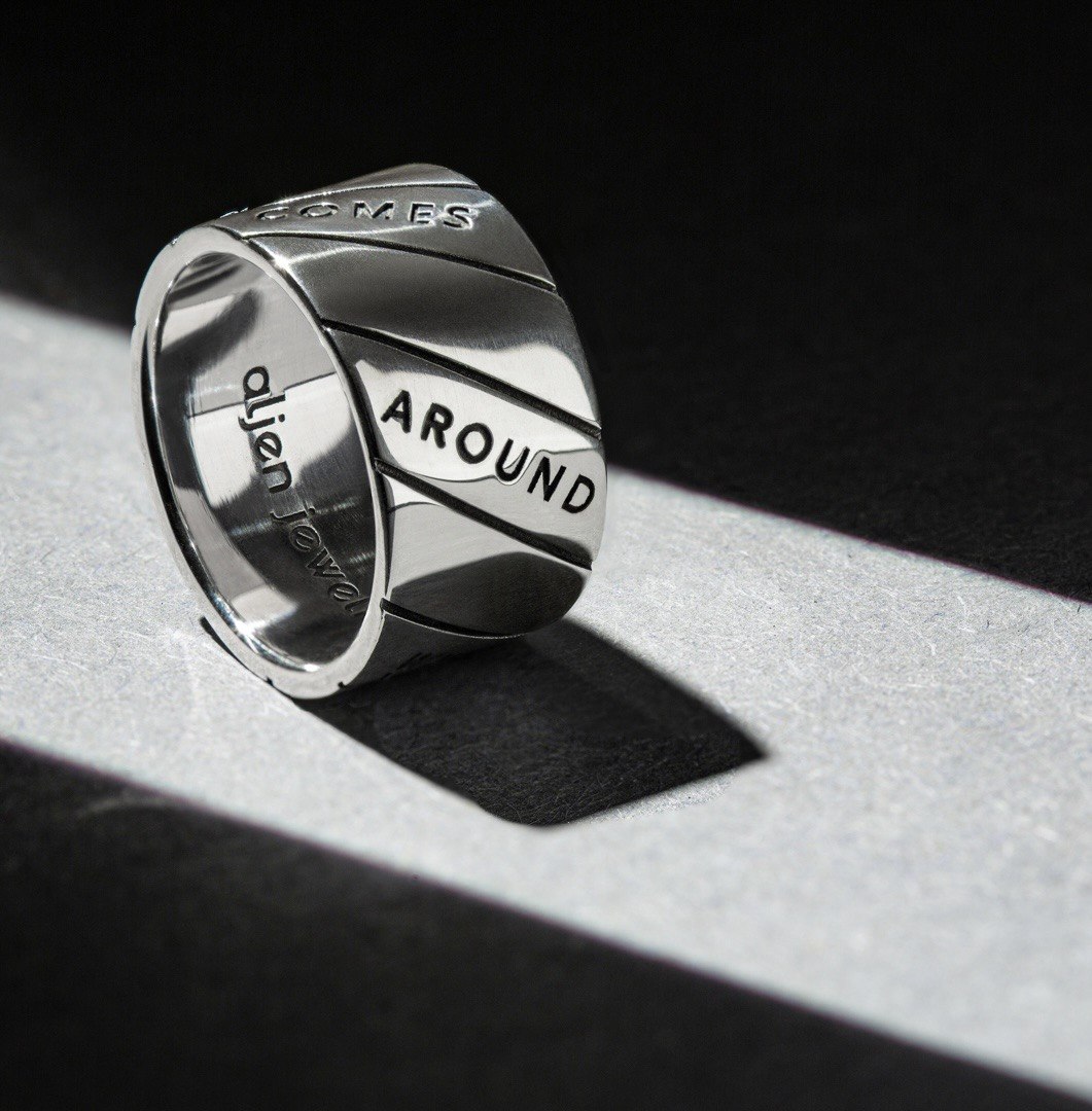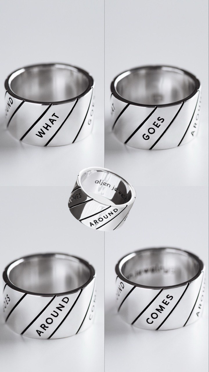 Every action and every thought comes back, and this silver ring engraved with “What goes around comes around” gently reminds you of that.
